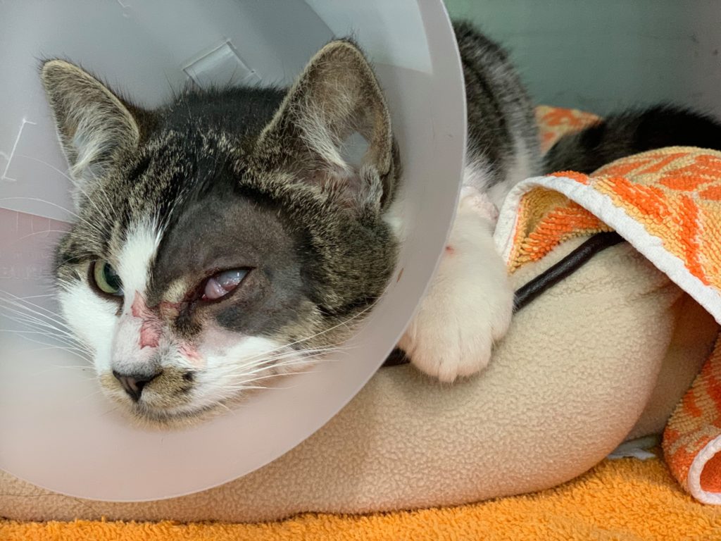 Nachdem wir sie dort abholten, brachten wir sie direkt zu unserem Tierarzt. Es hieß das Auge muss wahrscheinlich raus, bevor es ausläuft. Während der OP und genauerem hinsehen war es möglich, das Auge doch zu erhalten. Nun heisst es stündlich das Auge mit Tropfen zu versorgen, dass das auch so bleibt.